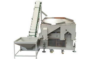 由于篩面振動(dòng)和穿過物料層氣流的作用,使顆粒間孔隙度增大,物料處于流化地狀態(tài),促進(jìn)了自動(dòng)分級(jí),比重大地石子沉人底層與篩面接觸,比重小的糧食會(huì)浮向上層,在重力、慣性力和連續(xù)進(jìn)料地推動(dòng)下,下滑到凈糧出口;而比重大的石子在篩面振動(dòng)系統(tǒng)的慣性力和氣流作用下,相對(duì)于去石篩面而上滑,經(jīng)聚石區(qū)移向至精選區(qū)。糧食經(jīng)過比重去石機(jī)的一次清理,除石率大于95%,除磚瓦、泥塊率大于60%,而且丟失糧粒少,清除砂石中含飽滿糧粒不超過100粒/千克。